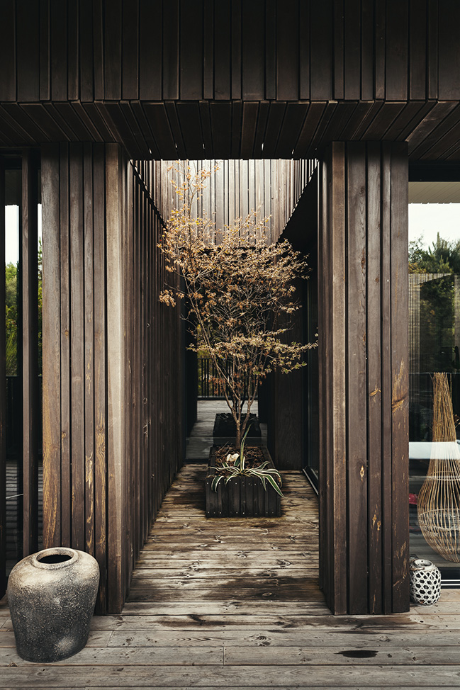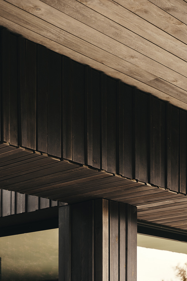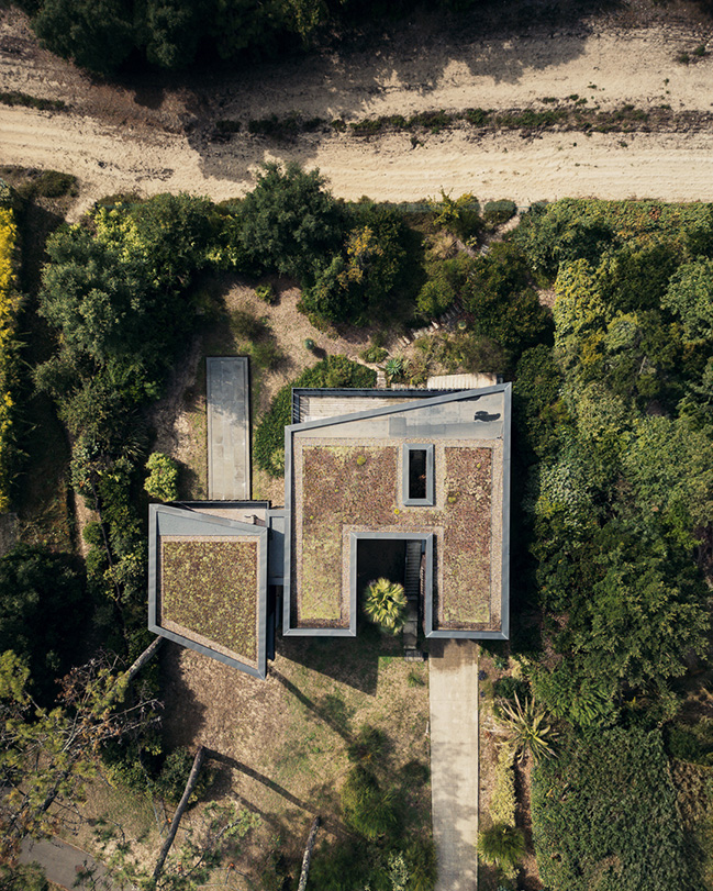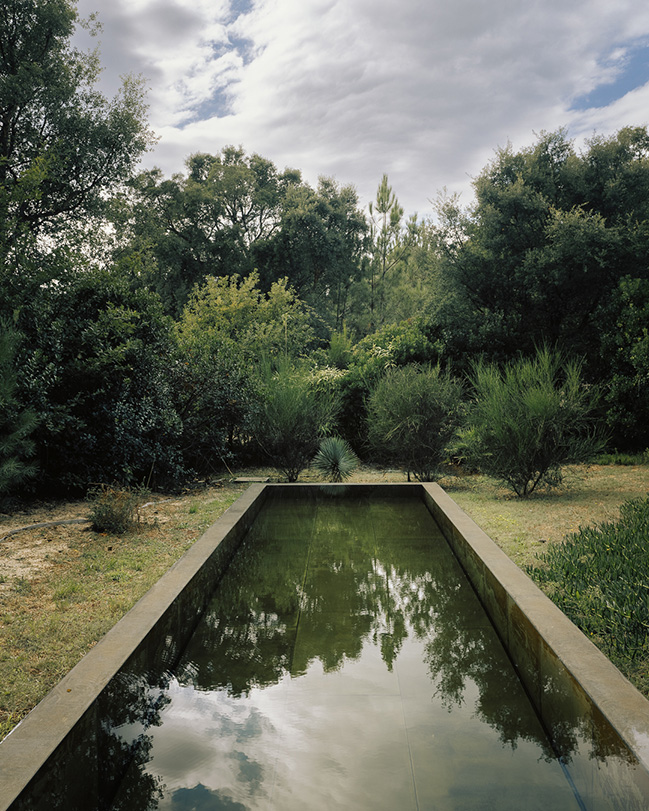 Inside, the composition, orientation and shape of the rooms are born of use and views, the ambiances are composed with the natural environment outside: water green, dark green, ocean blue, bark brown… These colors extend into the central patio, where the play between interior and exterior elements—accentuated by the wooden cladding—creates a unique atmosphere in every room. And throughout the home, the scent of the ocean lingers in the air.