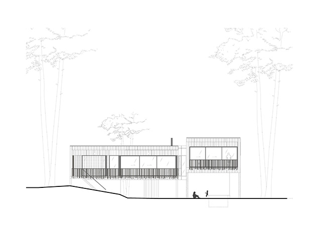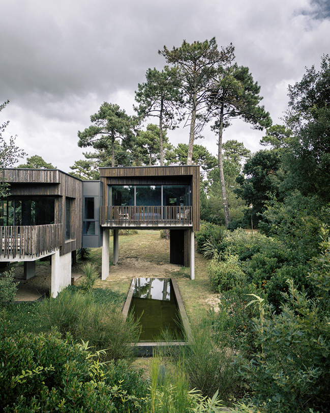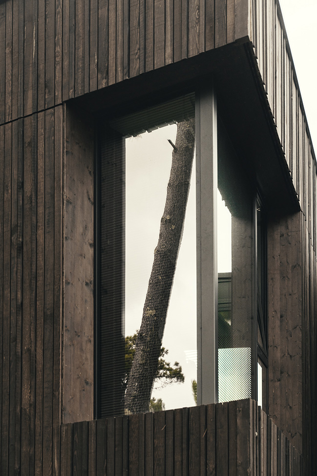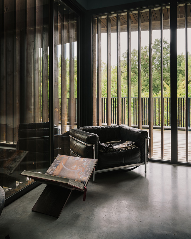 From the outset in 2018, Maud Caubet’s approach was to integrate the house into its environment, utilizing local resources and embracing the site's existing character. Built on concrete stilts, the house elevates above the ground, aligning with the verticality of the pine trees while introducing an unexpected contrast within the forest’s uniformity. The façades, clad in dark brown-saturated Landes maritime pine, echo the texture of tree bark, reinforcing this continuity.