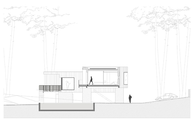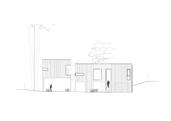 Off-site prefabrication—including timber-frame walls and wood fiber insulation—was carried out by a local carpenter, allowing both the house and its extension to be assembled with minimal site disturbance. By preserving the natural ground, the under-house space remains available for storage or shaded summer comfort, further enhanced by a lap pool discreetly nestled beneath the second volume. The green roof and joineries feature adjustable wooden louvers that filter sunlight while providing privacy.